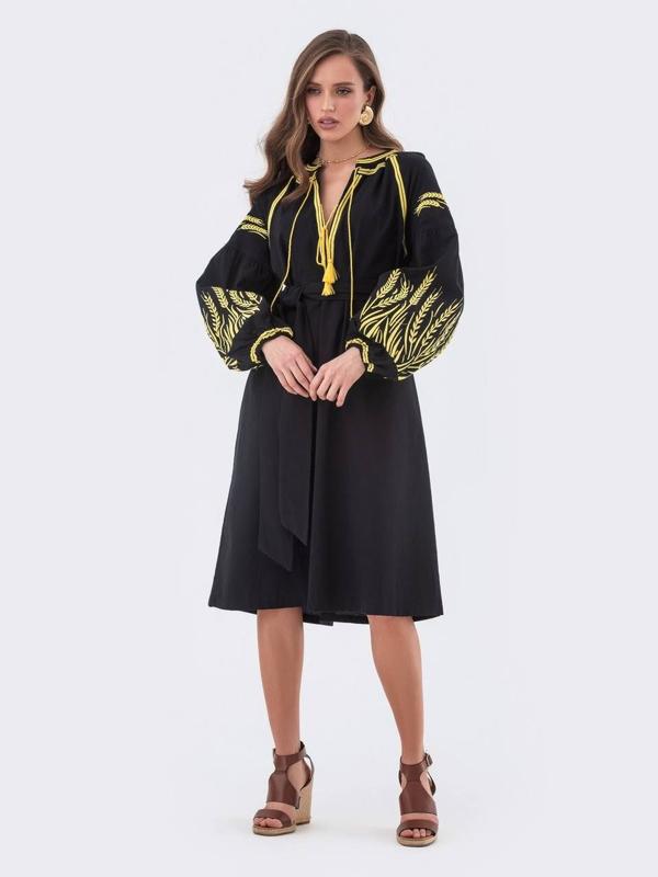 Колоритное платье с вышитыми колосками, украинное платье вышиванка, этно платье миди с выш...