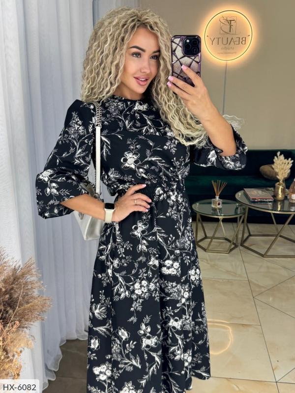 Сукня HX-6082 арт. sv 549 Размеры: XL, 2XL Тканина: Євро-софт Колір: Чорний, бежевий Опис: класичне легке плаття міді довжини з резинкою на талії. Модель має кишені, рукава декоровані рюшами.