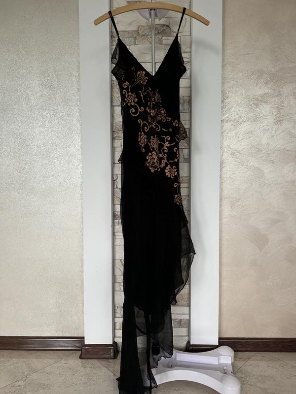 Шикарное платье миди с асимметричным подолом на тонких регулируемых бретелях. Воздушный полупрозрачный шелк, отделка из диагональных воланов и золотисто бронзовый цветочный рисунок в области груди и талии, V подобный вырез, приталенный крой. РАЗМЕР: XS ЗАМЕРЫ: длина 90/145 пог 46 пот 28/36 поб 46/54 СОСТАВ: шелк подкладка полиэстр СТАН: идеальный ➖➖➖➖➖➖➖➖➖ Вещи в наличии👗🧥👠 Фото на себе не делаете. 🙅♀️ Отправка: НП, Укрпочта📦 Вся необходимая информация придам😊