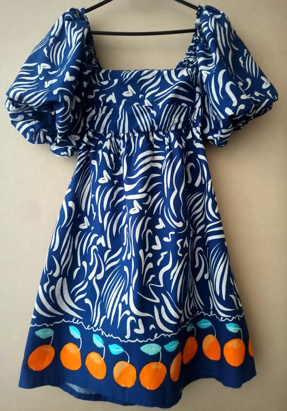 Яркое платье модного кроя, по спинке связывается на бант, размер 36/S по бирке, подходит на 38/М. Стан идеален. От подмышки до подмышки 40 см Длина от плеча 86 см ПОБ свободный Отправка новой почтой после полной оплаты на карту