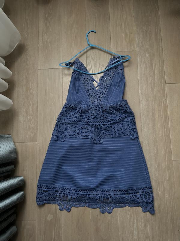 Платье яркого синего цвета В стиле Maje.. Оздоблена кружевами.