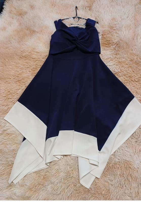 Очень необычное, изысканное платье, тмносинего цвета, от бренда OUIZ, с очень интересным низом. В этом платье Вы будете не такой, как все, потому что оно очень интересное.Ткань очень приятная и красиво тянется.Довжина от плеча до самой длинной точки сбоку 107 посередине 99.