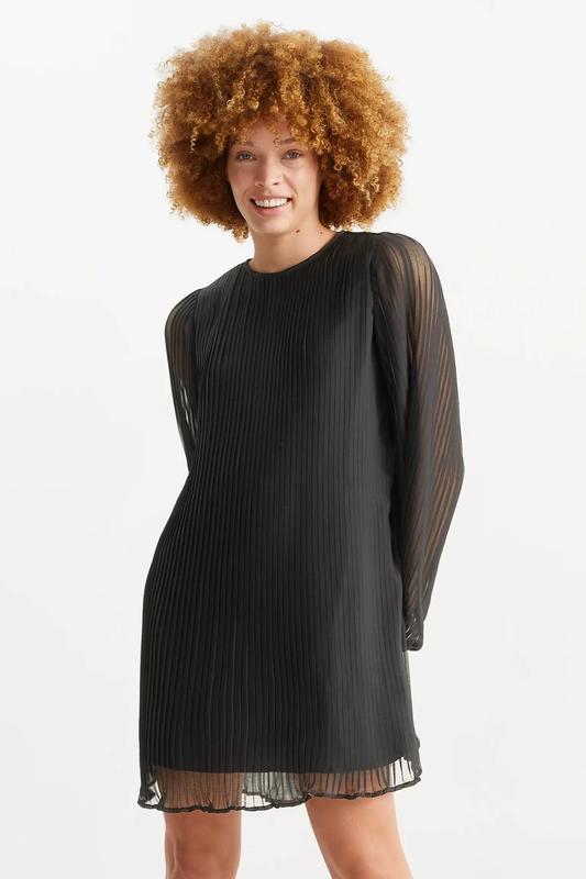 Плісирована сукня А-силуету з струмуючої напівпрозорої тканини. Ґудзик із розрізом ззаду на вирізі та фіксованою непрозорою накладкою. Розміри: 34, 42, 50. Можна одягнути як туніку, з пояском гарно пасує до обтягуючих штанів чи лосинів.