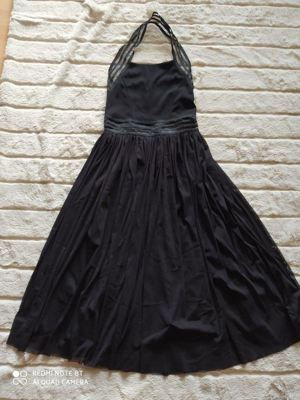 Платье праздничное черного цвета.Без дефектов.Стан очень красивое.По спинке цепочка. Ткань стрейчевая, тянется, но плотная на лифе. Юбка из стрейчевой сетки на подкладке. замеры в нерастянутом виде по груди -40 талия-33(резинка широкая) длина -108 cукня стрейчевая, тем лиф и талия растягиваются описание соответствует действительности