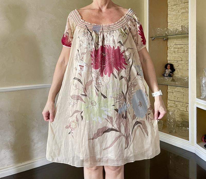 Max очень классное платье размер с бирки М, идет и на L. Длина 84 см. ПОГ от 46 до 60 см (присобранная). Ткань легкая, как воздух, мягусенька, дууже приятная к телу. Котон 65% полиэстер 35%. Состояние новое платье без бирки.
