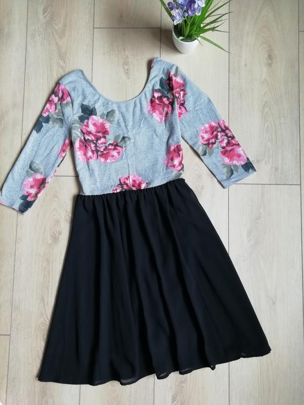 Платье трикотаж с шифоном. Размер М. Ориентируйтесь на замеры. Длина платья 87 см. Полуобхват груди 38 см. Полуобхват талии от 33 см потянется до 40 см. (в талии резинка). Бедра свободные. Верх платья трикотаж, юбочка шифон. На спинке вырез декольте чуть больше, чем спереди. Состояние идеальное. Без каких либо нюансов. Фото на теле нет.