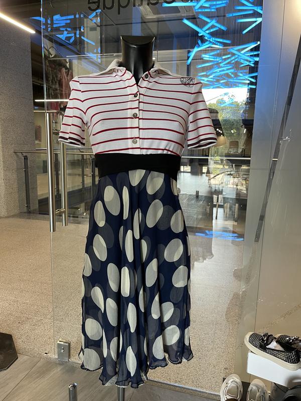 Платье итальянского производителя GF FERRE,сверху трикотажное коттоновое поло на пуговицах, сбоку молния, нижняя двойная шелковая юбка без подкладки.Подобою подвязывается на бант черной лентой.Новый, без дефектов