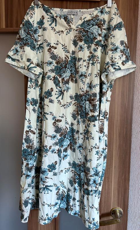 Платье женское, бренд Vovk.Оделось лишь пару раз. Очень свободное. На рост 170 длина до колена. Склад 65% льон 30% вискоза, 5% эластан Замеры: длина 98, ПО грудь 60, плечи 45, рукав 21