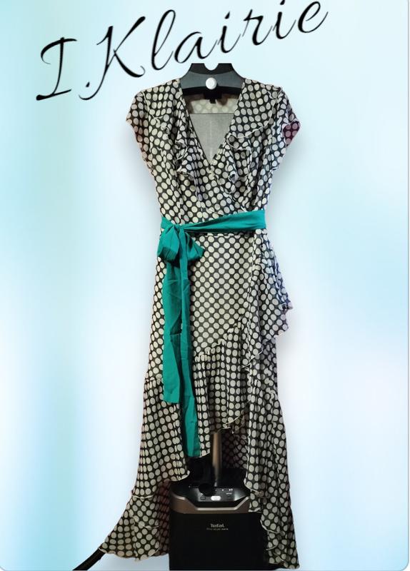 Отличное качественное платье в горох с имитацией запаха. Платье приталенное, в боковом шве потайная застежка молния, на подкладке. В составе верхней ткани и подкладки - вискоза+эластан (см.фото). Позаду довша, наче невеличкий шлейф. Платье в идеальном состоянии, без недостатков. Цвет темно синий в горох молочного цвета, пояс цвета морской волны. Замеры: плечи 40 см ПОГ 48-49 см по спинке, можно на больший объем за счет выреза на запах ПОТ 40 см ПОС около 53, но юбка идет на расширение. Длина от талии: перед 50 см позаду 100 см