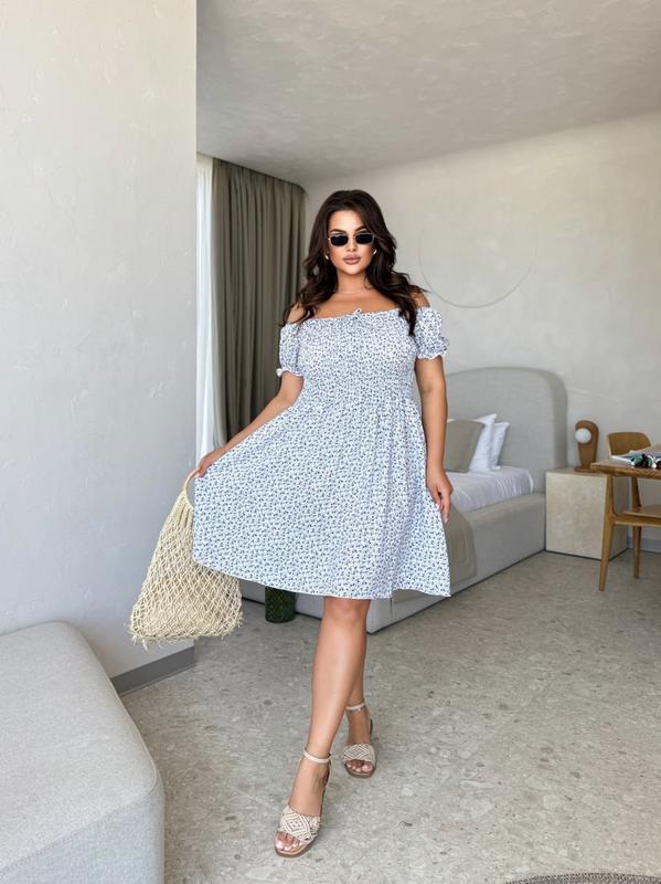 Платье. Ткань: штапель. Размеры: белый 48-50, 52-54, 56-58. черный 48-50, Замеры: (48-50) ОГ = ОТ резинка 80-110, длина 94, рукав 20. (52-54) ОГ = ОТ резинка 90-120, длина 96, рукав 20. (56-58) ОГ = ОТ резинка 100-130, длина 98, рукав 20. Верх - резинка, легко тянется. 1045 син