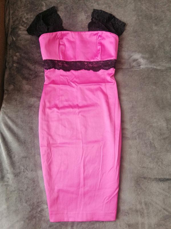 Розовое фуксия платье барби атласная обтягивающая миди с гипюровыми вставками 36 размер