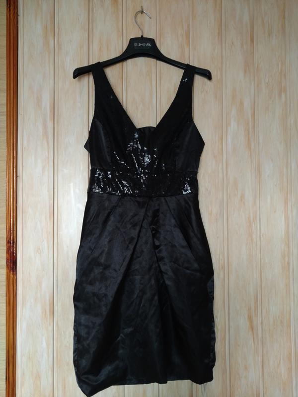 Вечірня шовкова сукня чорного кольору, розшита паєтками з глибоким декольте та відкритою спиною.