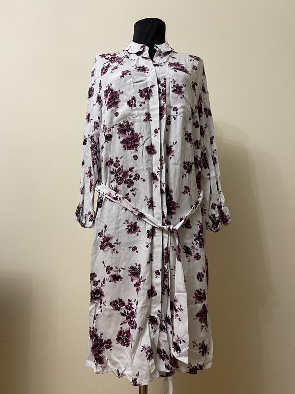 Сукня- сорочка білого кольору в квітковий принт бузкового кольору 38 розміру. Віскоза 100%. Бренд Mohito. Плечі 43 см, ПОГ 51 см, ПОС 56 см, довжина 98 см, рукав 51 см. Нова, з цінником 27,99 євро, без дефектів.