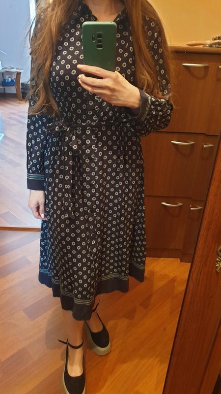 Платье из вискозы, длина миди интересный принт. Имеет тканевый поясок. Высокая талия, можно для беременных