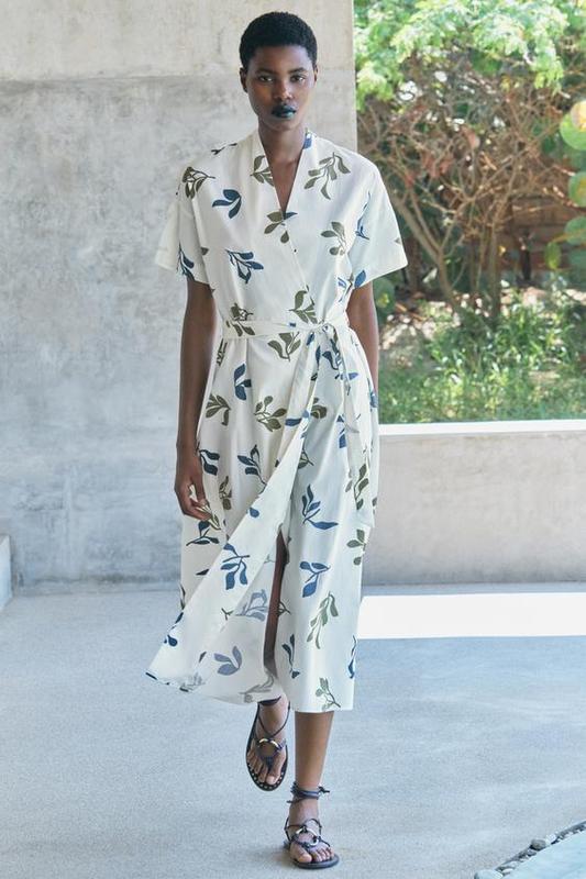 Платье средней длины из 100%-го штапельного хлопка с контрастным принтом, V-образным вырезом на запах, короткими рукавами, завязывающимся пояском из той же ткани и разрезом по низу. По наборке S-ка: ПОГ 51 см, талия 49 см (фиксируйте пояском под себя), бедра свободно, длина 130 см. По наборке М-ка: ПОГ 52 см, талия 50 см (фиксируйте пояском под себя), бедра свободно, длина 125 см. По наборке Л-ка: ПОГ 58 см, талия 53 см (фиксируйте пояском под себя), бедра свободно, длина 130 см.