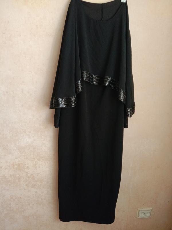 Шикарное черное платье. Бренд Shein с накидкой из шифона, расшитую пайетками. Само платье из качественной трикотажной ткани. По набору OXL, ориентируйтесъ по замерам. ПОГ 49-50см в нерастянутом состоянии, ПОБ 54см, длина по спине от горловины 136см.
