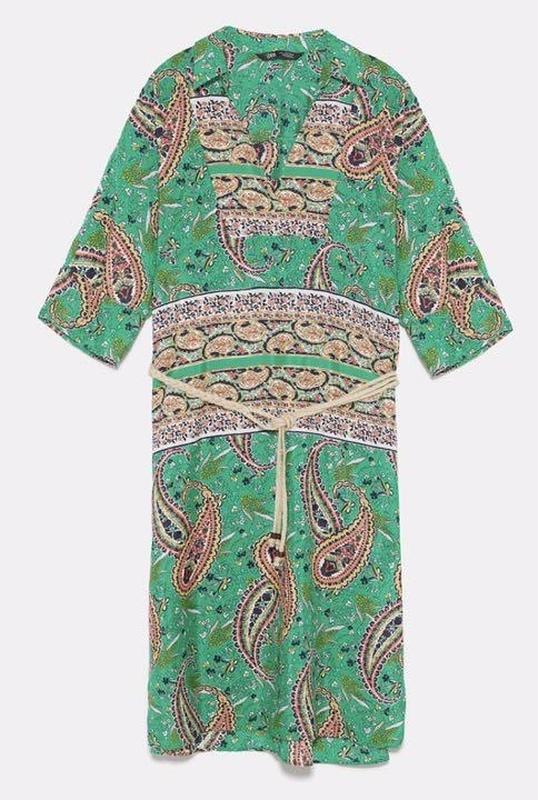 Платье с принтом «Пейсли» с поясом ZARA новое без бумажной бирки 🏷 и замечаний 👍Zara Платье-кафтан/комбинация, ЗЕЛЕНЫЙ с принтом «Пейсли», V-образный вырез, воротник размер указан L Ориентируйтесь на дополнительные детали замеров: плечи не обозначены ( любые) по дизайну свободны, по подмышкам 64см, ПОГ 62см, длина рукава от горловины 54см, длина изделия 116см, 💯 % полиэстер лёгкая, струящаяся приятная к телу и тактильно ткань