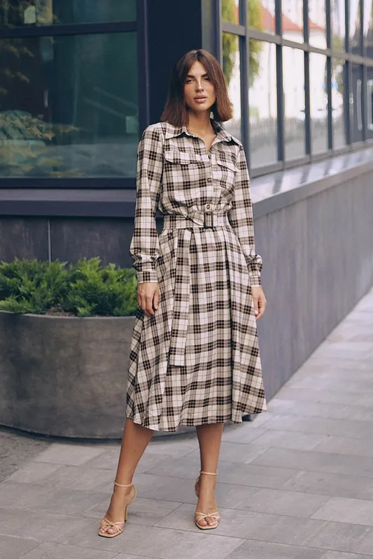 Бежевое платье миди с поясом приталенное платье с пышной юбкой