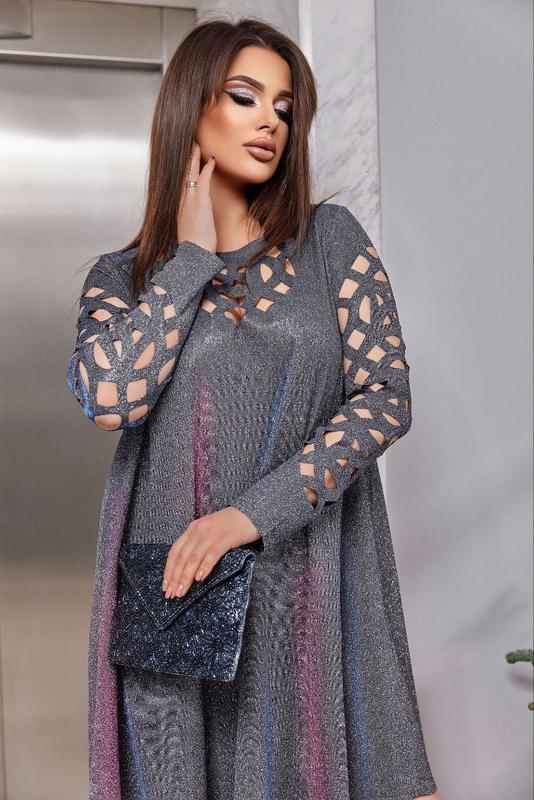 Сукня (Сияние с резкой) Размеры: 48-50, 52-54, 56-58. Размеры идут спаренные. Ткань: Три-же с глиттерным сиянием + лазерная кружная резкая по ткани. Тканина доброе тянеться. Очень красивое в живую Фактические измерения: По 52-54 размеру. Длина платья спереди- 98 см. Длина рукава - 61 см. ОГ- 114 см. ОТ- 140 см. ОБ- 160 см. По подолу- 214 см. К каждому следующему размеру добавлять + 4см (на одиночные размеры). На спарении + 8см помимо длины изделия. Рост модели на фото 170см. Параметры модели на момент съемки: БЛОНДИНКА ОГ: 116 см. ОТ: 90 см ОБ: 120 см. БРЮНЕТКА: ОГ- 106 см. ОТ- 85 см. ОБ- 114 см. Дополнительные характеристики: Платье свободного кроя трапеция, по горловине и рукавам идет лазерная резкая по ткани. Цвета изделия: Черный. Серебро. Электрик. Темно-синий. Золото- с зеленым оттенком. Цена :900🔖