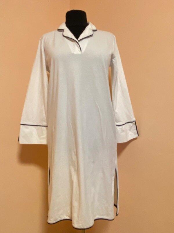 Трикотажное платье размер Л указано. Цвет - белый. Прямого кроя, демонстрировано на манекене 52 размера. Длина - 105см, плечи - 47см, рукав от плеча - 59см, от подмышки до подмышки - 57см, поб- 60см.