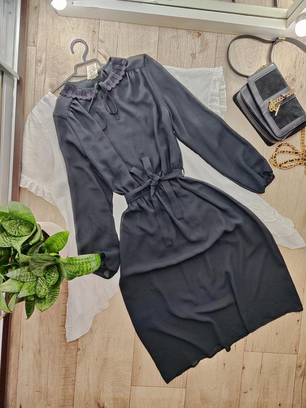 Шифоновое полупрозрачное платье миди в винтажном стиле с кружевным воротничком, с поясом от St Michael. Надевать нужно с комбинацией. Цвет насыщенный черный, камера не передает. Размер: XL. Состояние новой, сток.