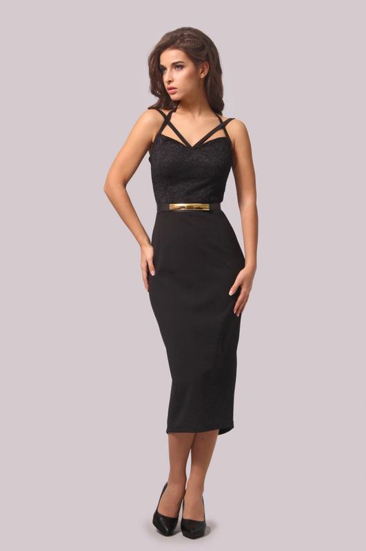 Платье прилегающего, суженного книзу силуэта, изготовлено из приятного трикотажа и кружева, кружево на груди и верхней части спинки поверх трикотажа. Платье отрезное с завышенной линией талии; на бретелях, перекрещенных спереди; с фигурным вырезом спереди и открытой спинкой. Верхняя часть выполнена с наложением кружева. Юбка с удлиненным воланом сзади за счет расширения среднего шва спинки. Застежка – потайная молния – в среднем шве спинки. Длина платья от завышенной линии талии до низа юбки спереди – 77 см, от завышенной линии талии по среднему шву спинки с учетом волана – 88 см. На фото модель с ремешком, платье продавалось без ремешка. Ткань: 50% полиэстер, 40% вискоза, 10% эластан. Размер XL Фактические замеры: полуобъем груди – 40 см, полуобъем талии – 42 см, полуобъем бедер - 52 см, общая длина – по переду 110 см, по заду 121 см.