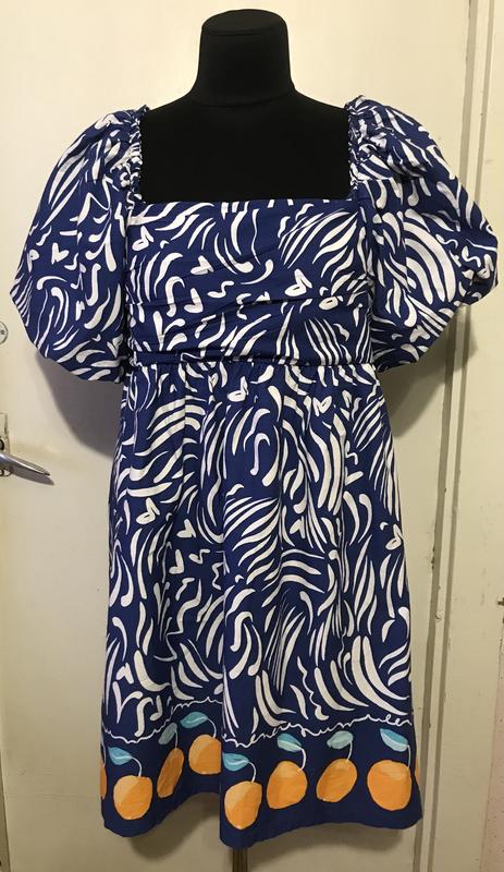 Мега круте плаття з гарним принтом . Пишні рукава, можна оголяти плечі, спинка на зав’язку , вільного крою . Розмір м, невелика л. По грудей 48/ довжина 92.