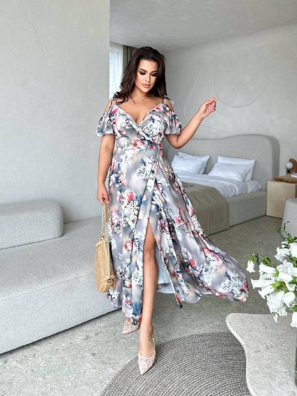 СУКНЯ НА ЗАПАХ Легка вишукана сукня довжина макси Фасон «На запах», спідниця клёш Тонкі бретелі на зав'язках, з відкритими плечима та рукавами-крильцями на гумці Тканина: софт 1 розмір 48-54 довжина виробу від бретель 140 см ОГ від 100до 116 2 розмір 56-62 ОГ від 118 до 128 vis