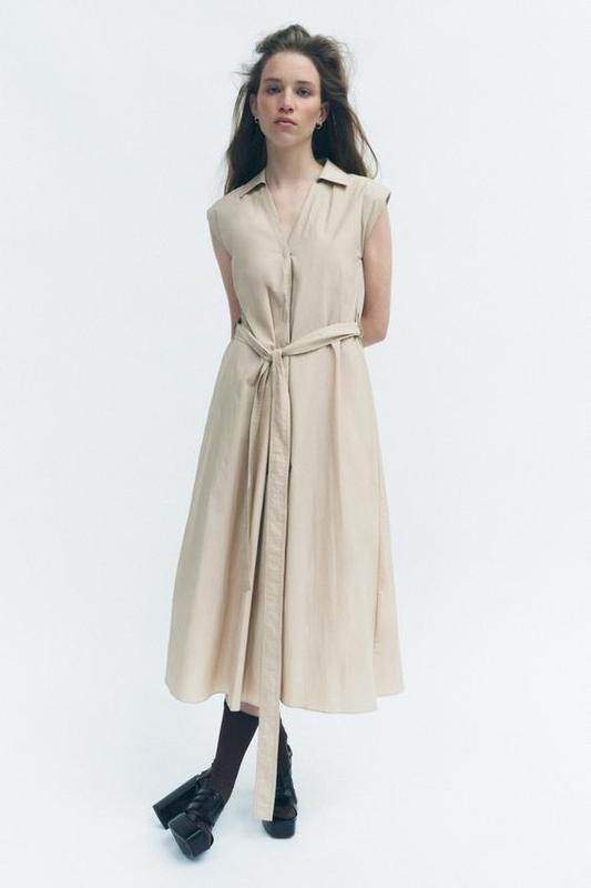 Жата сукня-безрукавка зі 100%-ї штапельної бавовни з V-подібним вирізом і сорочковим коміром. Застібається на приховані ґудзики спереду. Зав’язуваний пасок на поясі. 100% органічна бавовна