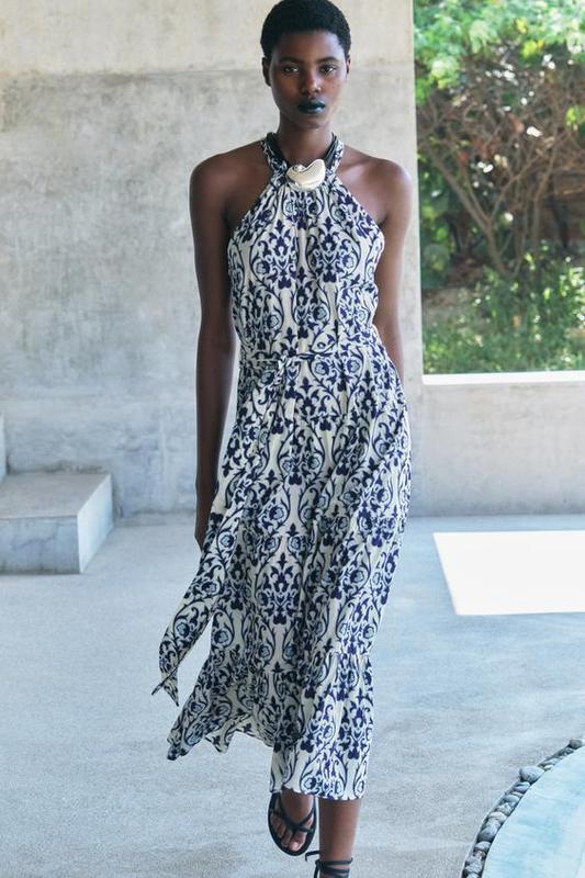 Сукня середньої довжини з контрастним принтом, коміром хальтер, відкритими плечима, зав’язуваним паском із тієї ж тканини та воланом унизу. 100% бавовна.