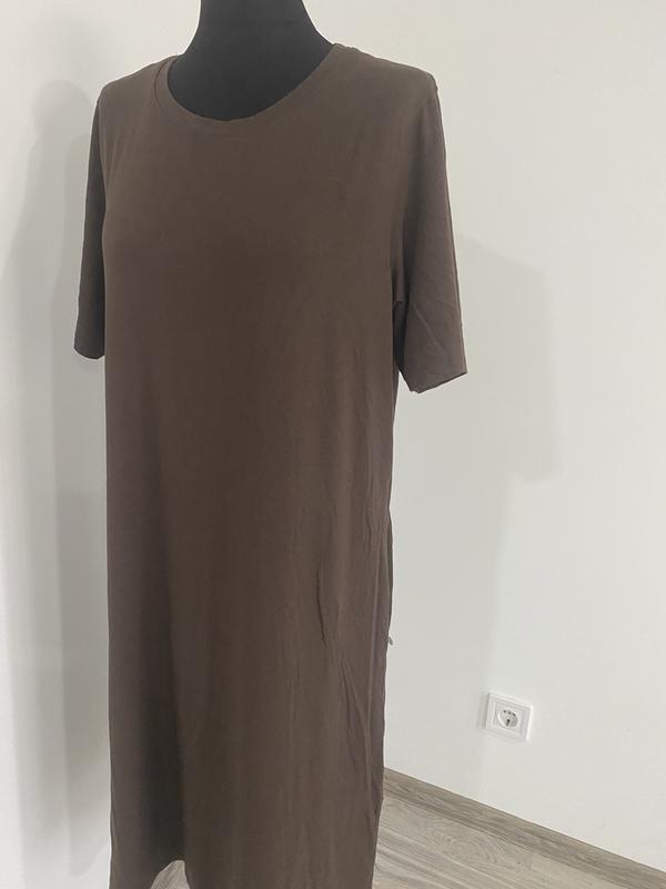 Платье красивого коричневого цвета из натуральной вискозы. Модель красиво садится по фигуре, имеет сбоку карманы, коробки рукав, на спинке регулируется объем пояском.