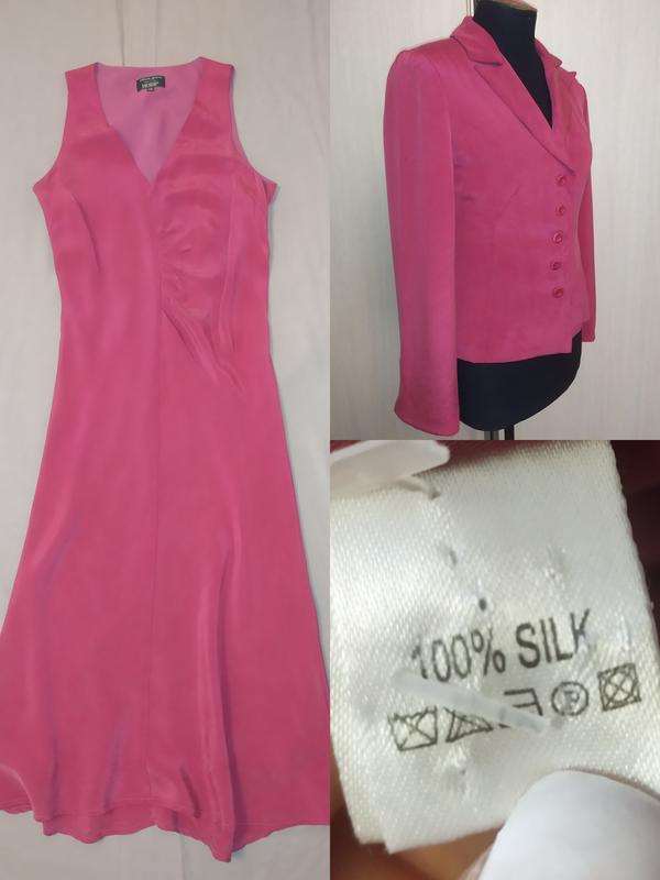 комплект из шелкового платья и жакета. новый, скорее всего, комплект. платье на подкладке, без застёжек!!! пиджак застегивается на пуговки. у платья и пиджака идеальная посадка благодаря крою по косой и правильным выточкам на пиджаке. на параметры 92-72-94см отлично садится, можно и больше! длина платья 127см пог максимально 52см пот максимально 48см длина пиджака 53см длина рукава 48см пог пиджака 47см пот пиджака 40см плечи 41см