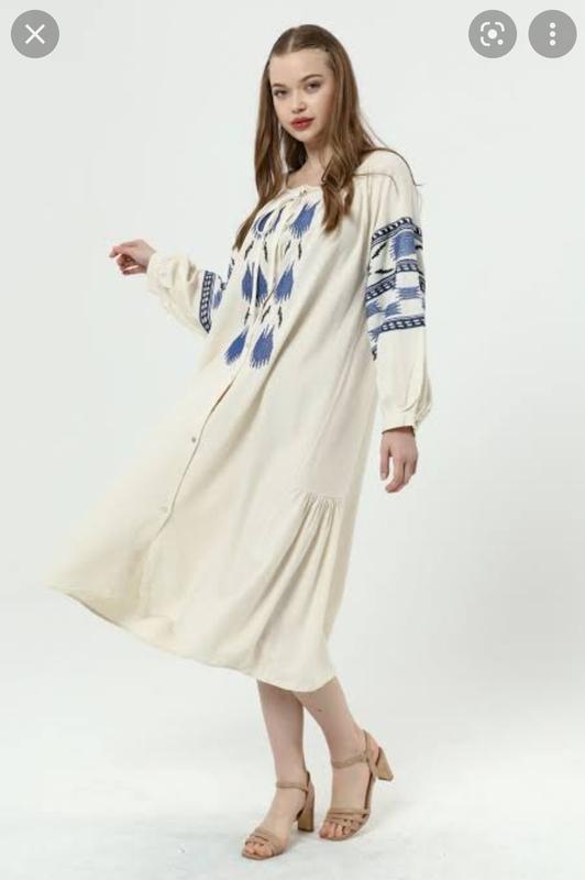 Ткань светло бежевого цвета с синей вышивкой на груди и широких рукавах тканина котон замеры на размер С Длина платья 111 см обхват груди 118 см обхват талии 162 см рукав 58 см обхват ягодиц 130 см замеры на размер М длина 112 см обхват грудей 123 см обхват талии 130 см обхват ягодиц 140 см замеры на размер Л длина 114 см обхват груди 127 см обхват талии 140 см обхват ягодиц 154 см рукав 63 см післяплата самовывиз кистей безпечна оплата #muhteshem100