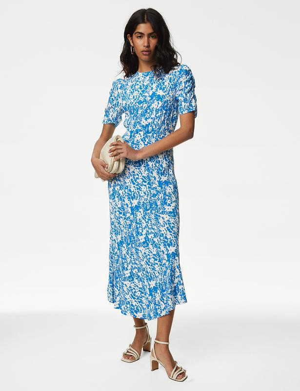 Блакитна з білим сукня міді M&S Розмір М Напів обхват грудей 44+49 см Талії 37 см Стегон 59 см тканина тягнеться трошки Довжина від горловини 126 см Зріст моделі 177 см 100% віскоза Стан ідеальний Стан нового