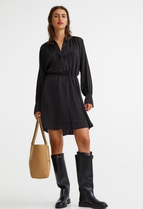 Платье новое, из плавного атласного плетения с коротким воротником-стойкой, скрытой планкой на пуговицах и тонким съемным поясом на завязке. Модель свободного кроя с длинными рукавами реглан, широкими манжетами на пуговицах с разрезом и прямым низом. Без подкладки. Размер: Рост человека на фото 178 см/5'10" и одет в размер S Модель: расслабленный крой Композиция: 100% полиэстер