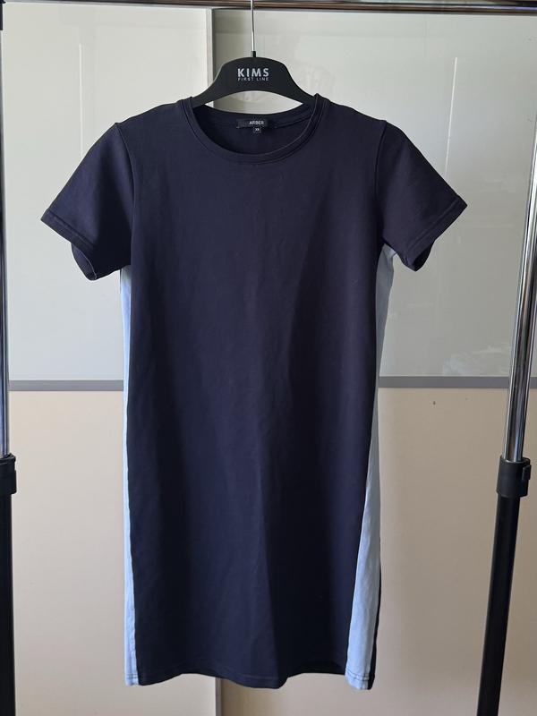 Темно синее платье прямого кроя с голубыми лампасами.Материал качественных трикотаж. Состав:95%хлопок,5%полиэстер. Замеры:Длина 82см,ПОГ46см,плечи 38см РазмерXS(42)можно на S(44)