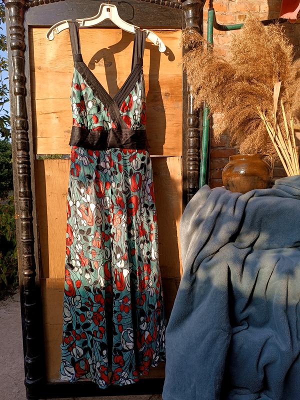 Платье из смеси шелка и вискоза в цветах Тиффани. Украшена черной лентой по лифу. Пояс завязуєтся по заду. Красивая длина ниже колен, ложится большими складками.