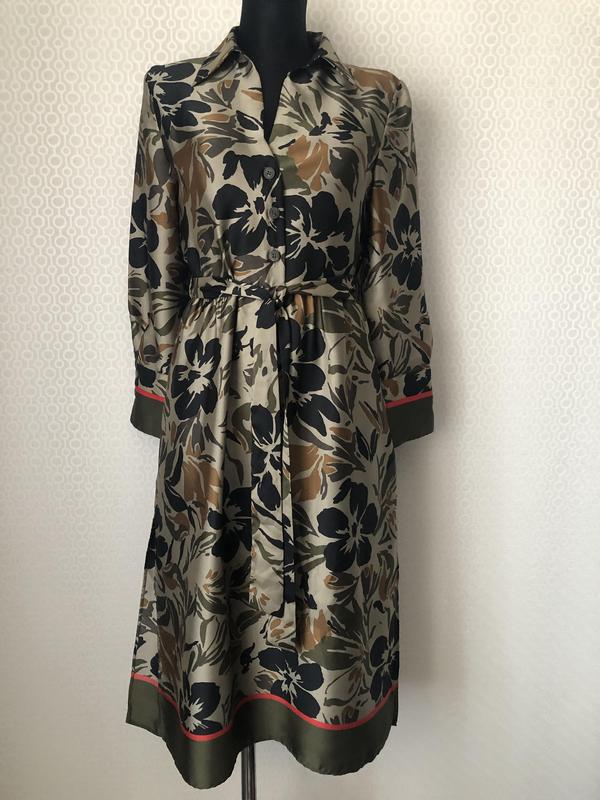 Платье рубашка с поясом в трендовый принт от ZARA, размер S. Цветочные мотивы в рисунке ткани и сочетание бежевого, черного, оливкового цветов с обрамлением красным по краям длины делают это платье выделяющимся на общем фоне. Отрезное по линии талии. Пояс в цветовой палитре основной ткани. Рубашечный воротник с V-образным вырезом. Пуговицы от воротника до линии талии. Рукав оканчивается широким манжетом на две пуговицы. Манжет при желании можно подвернуть. Внизу по бокам идут разрезы. С наружной стороны ткани внизу имеется след (фото 7), который учтён в цене. Замеры изделия в не растянутом виде, см: плечи 39, подмышки (примерно равно ПОГ) 45, ПОТ 37,5, ПОБ (Замер делаю на расстоянии 65 см от плечевого шва, если вещь короче, то по краю изделия) 55, длина 113, длина рукава 57. Объёмы манекена, см : плечи 39, ОГ 87, ОТ 63 ОБ 90 Отправляю Новой почтой либо наложенным платежом (при условии оплаты доставки в оба конца), либо по предоплате на карту Приват, Укрпочтой по предоплате, Meest по предоплате Продаю много фирменных вещей Airfield, Strenesse, Gerry Weber, Steilmann, Brax, Bonita, Basler, Frank Walder, Apanage, Olsen, Ulla Popken, Gardeur, Monari, Rabe, Guess, Hauber, Marks&Spencer, Concept K. Много новых вещей (с этикеткой) - можно на подарок. Смотрите другие мои объявления. Спасибо, что заглянули :-)