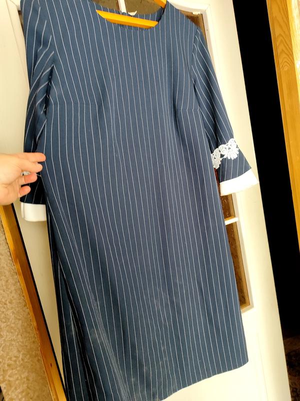 Синие в полоску, с прорезными кармашками, сзади на замочке. Ткань пружинит, форму не теряет. Плечи 41. пог 51, 53. пот 48 Поб 55. рукав 43. длина 98 см