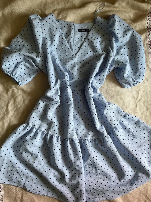 Романтичное женское платье от бренда F&F Имеет рукава воланы, вырез на декольте и принт черный горох Размер:L/XL Цена:399грн Для заказа пишите в личные