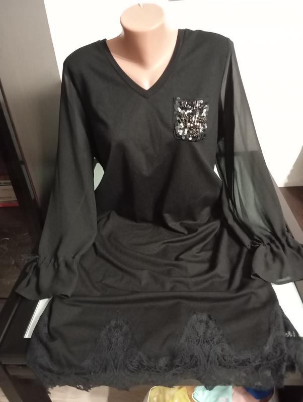 Платье женское прямое. Черного цвета. Ткань комбинированная. Рукава шифоновые, низ обработан кружевом, декоративный кармашек в пайетками и камушками. Ткань красиво тянется. Размер L-XL. Качество отличное. Состояние новой