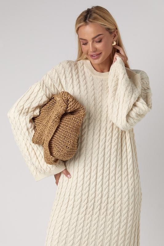 С таким вязаным модным платьем твои будни будут максимально уютными, а ее трендовые узоры из косичек, расположенные по всему изделию, еще и визуально удлиняют силуэт. В изделии линия плеча удлинена, края прямого низа и длинных рукавов выполнены из вязки в виде узкой манжеты. Круглая горловина дополнена окантовкой с тонкой резинкой. Это вязаное платье покорит твое сердце с первой же примерки!