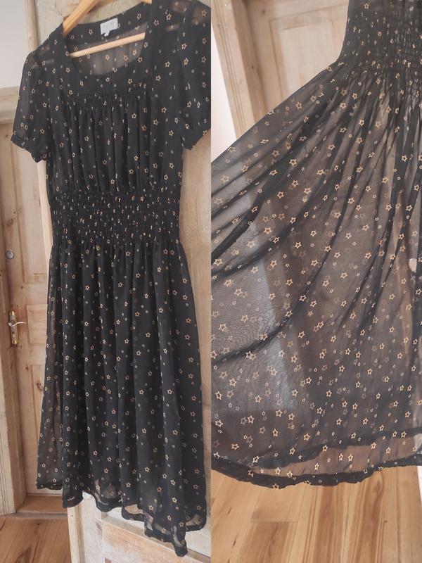 Легкое прозрачное шифоновое платье в звездочки. Сбоку застегивается на молнию, рукава короткие на пуговицах, на талии резинка. О.г. 40см, длина 104см