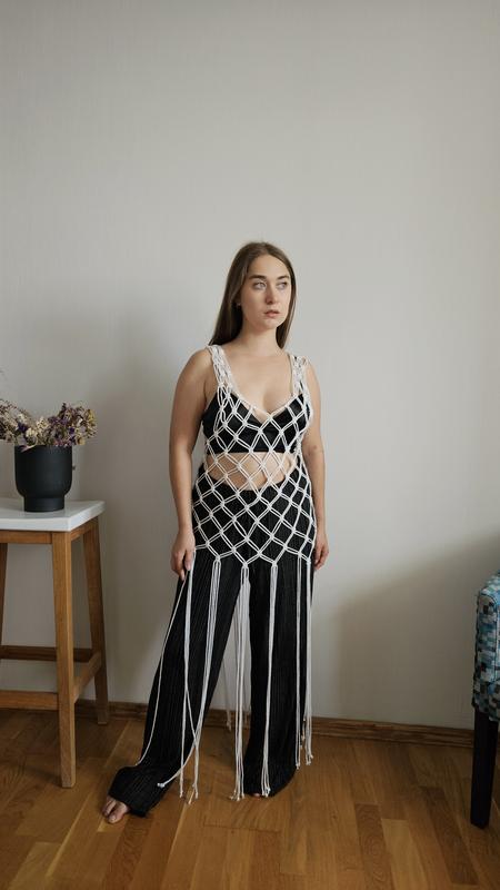 Сукня-макраме за вашими мірками. Нитка сукні міцна, не кошлатиться, можна прати. Довжину обираєте під себе, виготовлення до 2ох днів. Також можемо зробити в іншому кольорі. зараз в наявності є нитка біла, молочна.