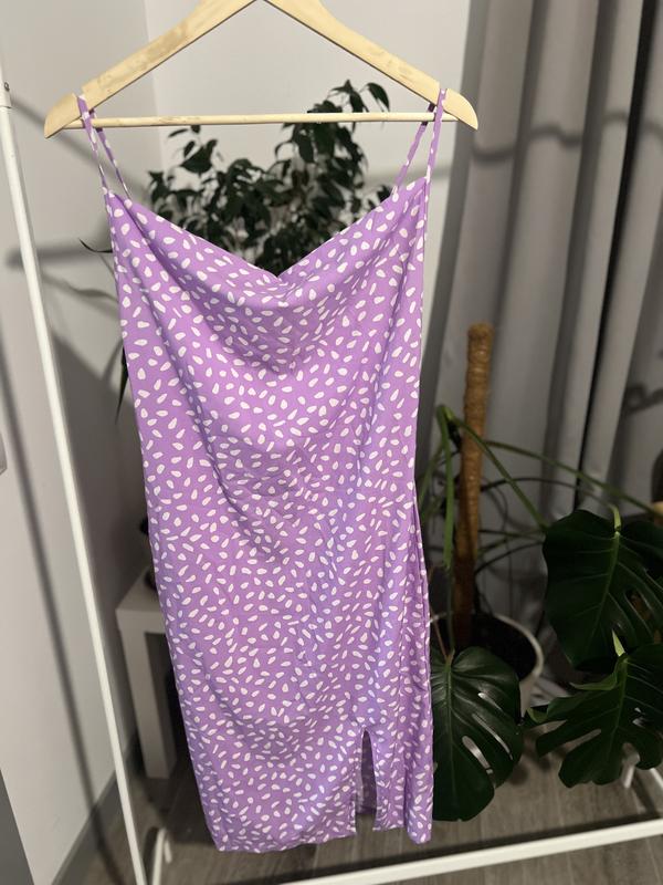 Платье насыщенного фиолетового цвета в белую бутылку. Легкое и приятное к телу. Есть разрез в низу платья по ноге.
