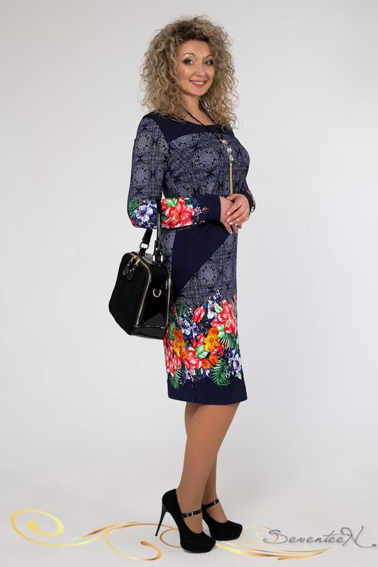 Темно-синее легкое платье с ярким цветочным принтом. Весенний рисунок внизу платья и на рукавах придаст образу свежести и контраста. Однотонные вставки на поясе и груди сделают его оригинальным и стильным. В таком платье вы всегда будете чувствовать себя уверенной и жизнерадостной. Элегантное платье темно- синего цвета станет универсальным вариантом гардероба для любого повода. Необычный узор по всей длине платья подчеркнет оригинальность вашего вкуса и добавит образу элегантности и сдержанного шика. Заказать синее платье с цветочным рисунком кораллового цвета по краю можно в розницу недорого или оптом по скидочной цене. В интернет-магазине Seventeen платье можно купить в кратчайшие сроки благодаря доставке по Украине. Выгодная стоимость и высококлассное качество напрямую от производителя лучшее сочетание!