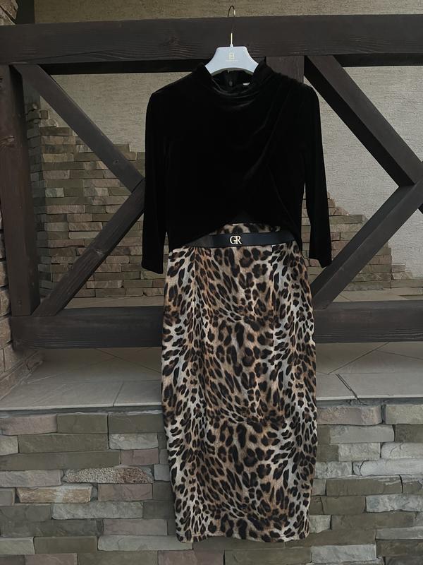 Элегантное платье, которое сочетает в себе роскошный черный бархат и яркий леопардовый принт. Верх платья с длинным рукавом и высоким горлом создает изысканный силуэт, а юбка-карандаш подчеркивает фигуру. Платье дополнено тонким поясом со стильной пряжкой. Идеальный вариант для вечеринок, романтических свиданий и других особых событий.