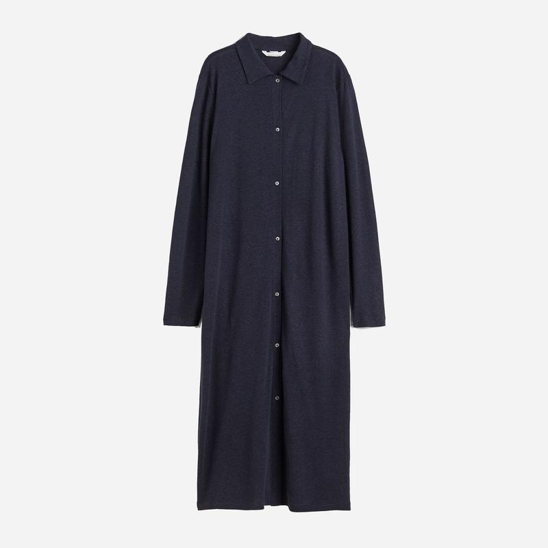 Есть также в светлом цвете Трикотажное платье длиной до колена из мягкой смеси льна и вискозы. Модель с длинными рукавами, воротником и сплошной планкой на пуговицах с мерцающими перламутровыми пуговицами. Прямой, свободный крой