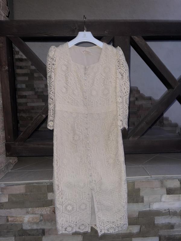 Вишукана мереживна сукня бежевого кольору з короткими рукавами-ліхтариками. Плаття має приталений силует, що підкреслює фігуру, і застібається на декоративні гудзики спереду. Нижня спідниця виготовлена з підкладкової тканини для комфорту. Ідеальний варіант для створення жіночного та романтичного образу.
