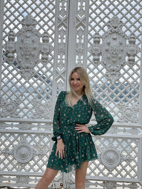 Дуже гарна сукня насиченого кольору зеленої трави у квіточку з довгими рукавичками, на талії вшитий тоненький поясок, який підкреслює талію. Сукня розміром s, але підійде і на m. За замірами звертайтесь у особисті повідомлення.